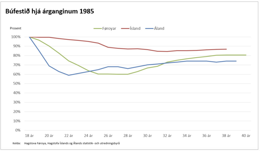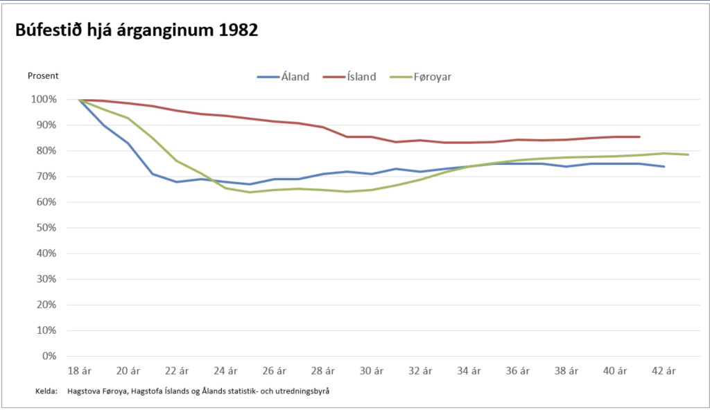 Talvan vísir, at í Føroyum eru tað 80% av teimum, sum eru fødd í 1982,sum búsettist í Føroyum og 20% búsettist uttanlands. Í Álandi er støðan upp aftur verri, men Íslandi er støðan munandi frægari.Tað sæst eisini, at tað eru nógv, sum fara uttanlands í tjúgunum, helst í útbúgvingarørindum ´
