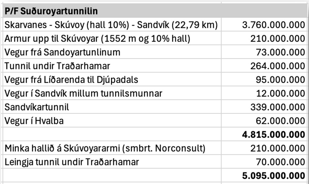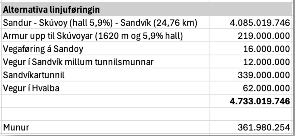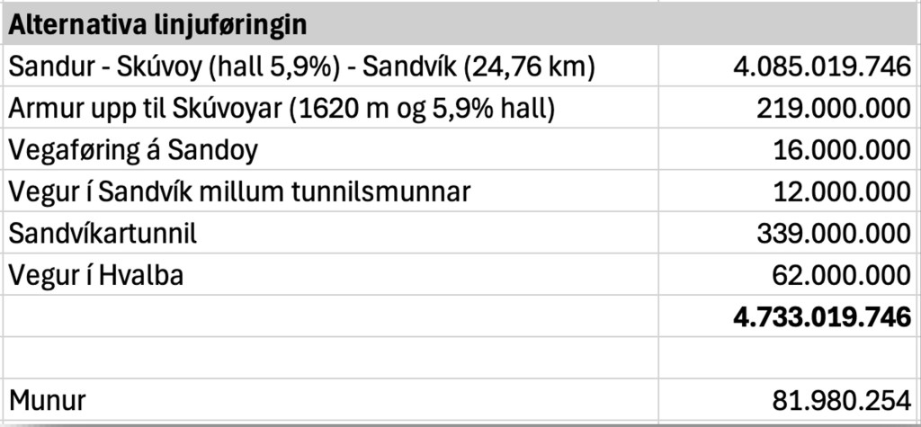 Alternativa linjuføringin er sostatt millum 82 og 362 mió. bíligari enn loysnin hjá P/F Suðuroyartunlinum.