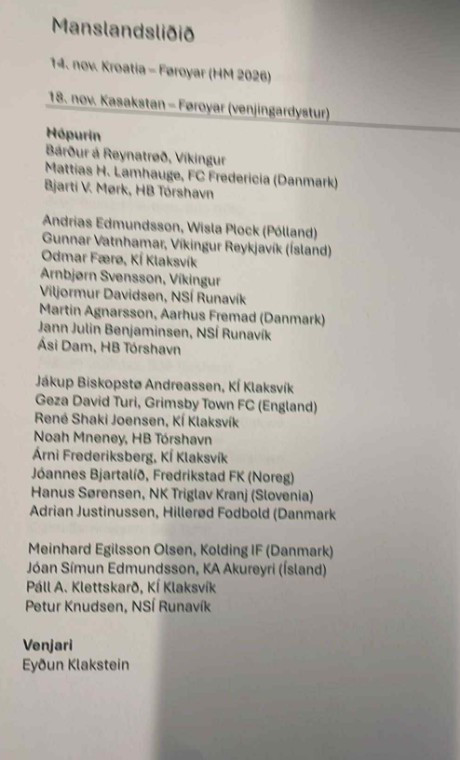 Ein heilt nýggjur maður var á listanum, tá ið Eyðun Klakstein nú fyrrapartin kunnaði um, hvørjum 23 spælarum hann hevur sent boð eftir at vera við á ársins síðstu landsliðsferð.