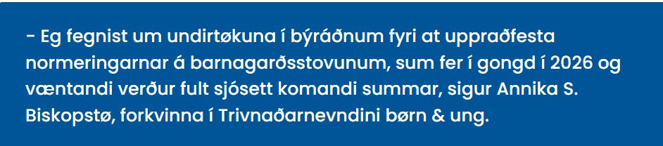 Annika S. Biskopstø upplýsir, at hetta er framhald av arbeiðinum at góðskumenna dagstovnaøkið, sum byrjaði í 2023, har eitt av tiltøkunum var at uppnormera vøggustovurnar – ein uppraðfesting, sum hevur víst seg at eydnast sera væl, bæði fyri børn og starvsfólk.