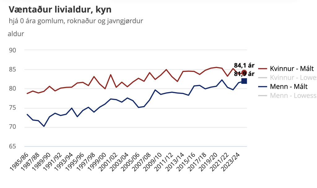 Tað vísir ein nýggj uppgerð hjá Hagstovuni. Væntaður livialdur, er, hvussu leingi fólk í einum aldursbólki kunnu vænta at liva í miðal - um so er, at støðan annars ikki broytist.
