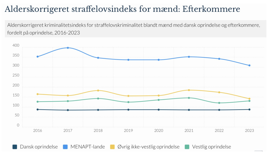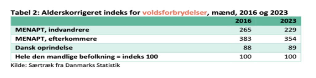 “Mandlige indvandrere fra MENAPT-landene havde i 2023 et alderskorrigeret straffelovsindeks på 218, jf. tabel 1 på næste side. Det svarer til, at deres kriminalitetsniveau var omkring 2 gange højere end gennemsnittet for den mandlige befolkning under ét, når der er taget højde for aldersforskelle.