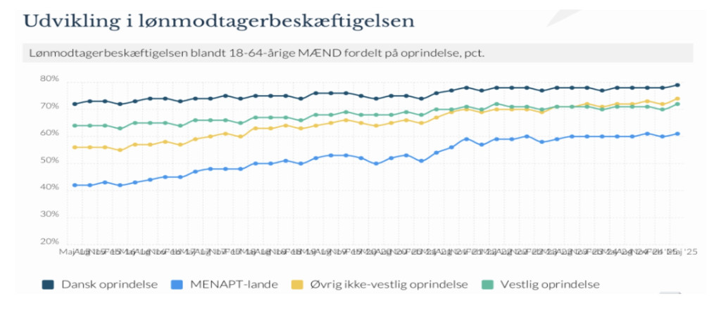 Tølini frá Danmarks Statistik vísa eitt greitt mynstur: fólk úr MENAPT-londum og eftirkomarar hava eitt munandi lægri knýti at arbeiðsmarknaðinum, eru yvir umboðað á almennari umsorgan (forsyrging) og hava hægri kriminalitetsindeks enn persónar við donskum uppruna.