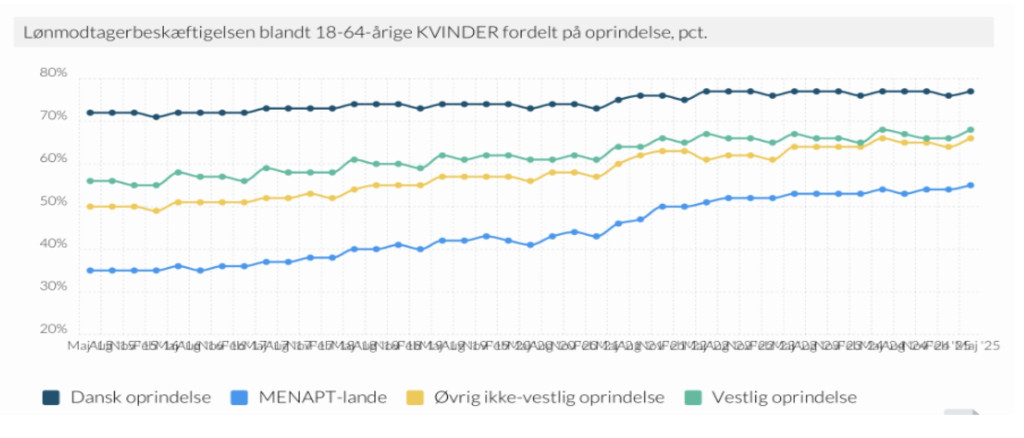 Hjá kvinnum úr MENAPT londum liggur arbeiðsføri á umleið 55%. Til samanberingar liggja danskar kvinnur á 77%. Hetta merkir ein mun í arbeiðstiltøk á gott 20 prosentstig.