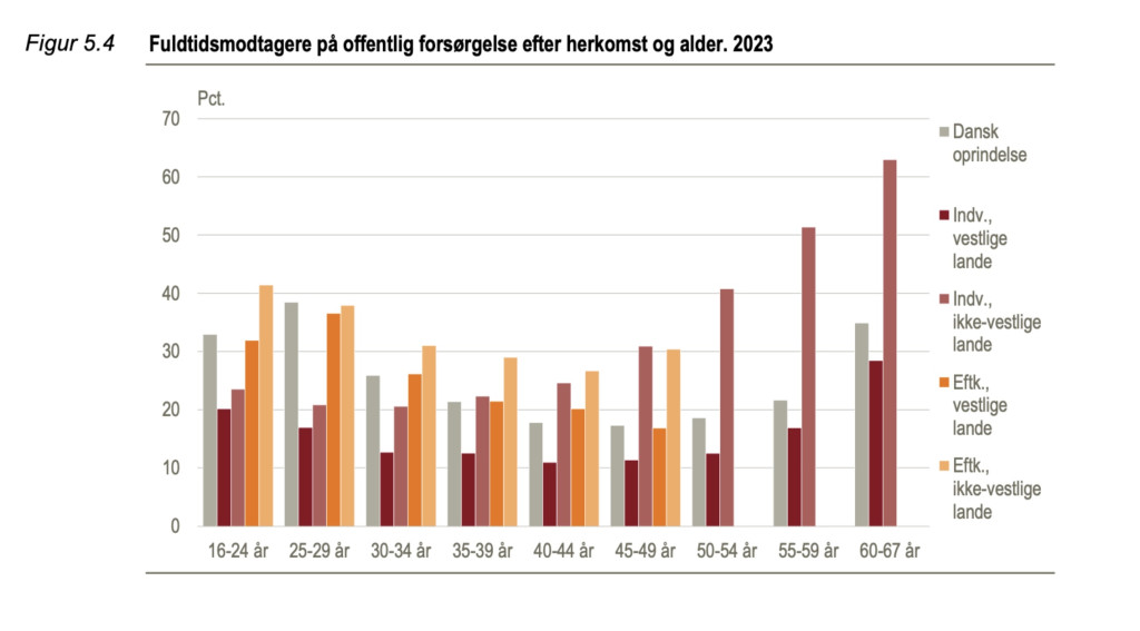Av myndini síggja vit, millum annað, at aldursbólkinum 50–54 ár og uppeftir hava tilflytarar úr ikki-vesturlendskum londum hægstu umboðan í almennari uppihaldsveitingum.
