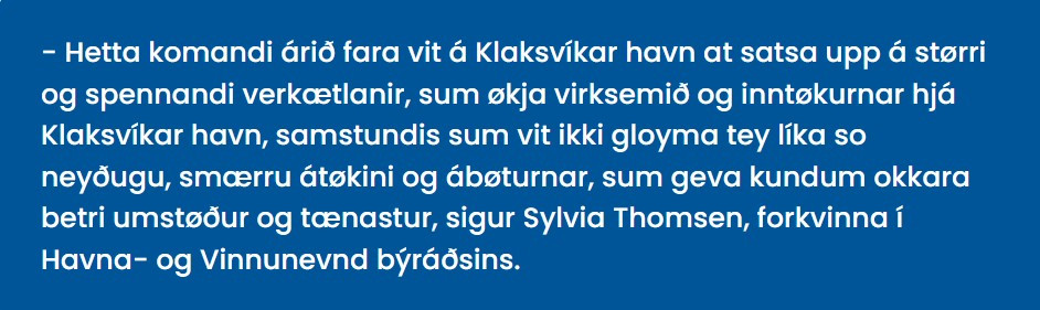 - Á henda hátt fara vit miðvíst til verka at skapa bestu fortreytir á Klaksvíkar Havn fyri betri umstøðum og tænastum til kundarnar, samstundis sum vit hava sett okkum hægri langtíðarmál um vøkstur og menning av okkara virksemi, sigur Sylvia Thomsen, forkvinna í Havna- og Vinnunevndini og býráðslimur, umboðandi Sjálvstýrið.