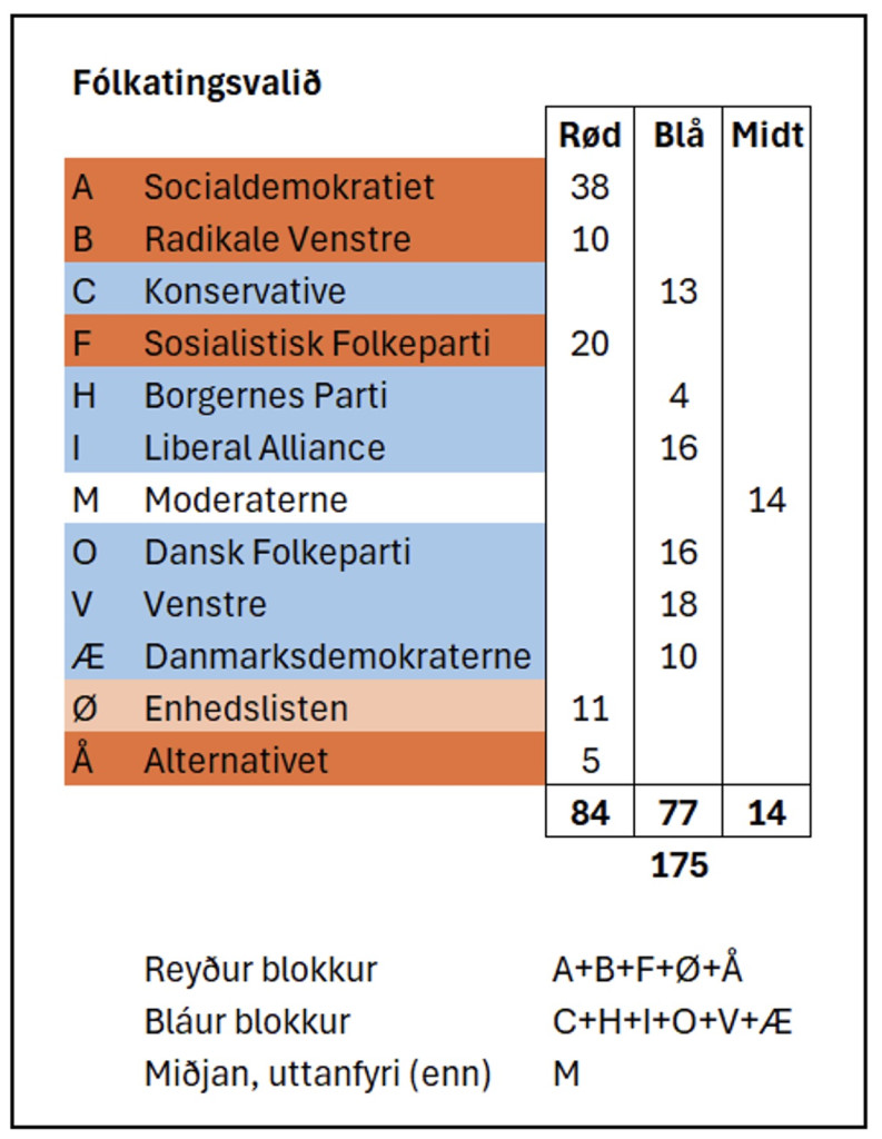 Miseydnast tað Mettu at skipa stjórn, verður uttan iva hugt eftir Lars Løkke Rasmussen, sum við sínum 14 mandatum situr í eini lyklastøðu, eisini í samband við sonderingina, ið Metta nú ger. Tað er ógvuliga ósannlíkt, at Løkke ikki er partur av eini komandi samgongu. Morten Messerschmidt frá Dansk Folkeparti skeyt tó eina borgarliga stjórn upp, har ið hvørki hann ella Løkke vóru ráðharrar.