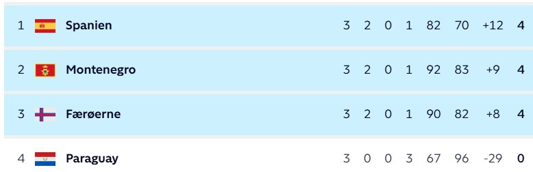 Spania vann í kvøld 31-26 ímóti Montenegro. Tað ber við sær, at Paraguay tapti allar tríggjar dystirnar við samlaða málmuninum – 29.