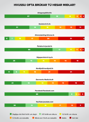Kringvarpið og Portalurin og nógv mest nýttu miðlarnir í Føroyum. 57 prosent av teimum spurdu nýta Kringvarpið í minsta lagi eina ferð um dagin, meðan tað talið er heili 60 prosent fyri Portalin.