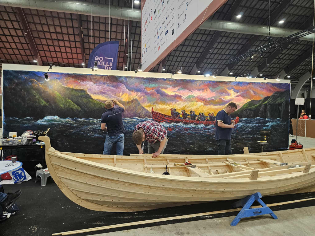 Í básinum stendur føroyskur bátur, sum John Høgnesen hevur smíðað til høvið. Og bakgrundina ger Livar Nysted, sum málar ein stóran málning av einum 10-mannafari.