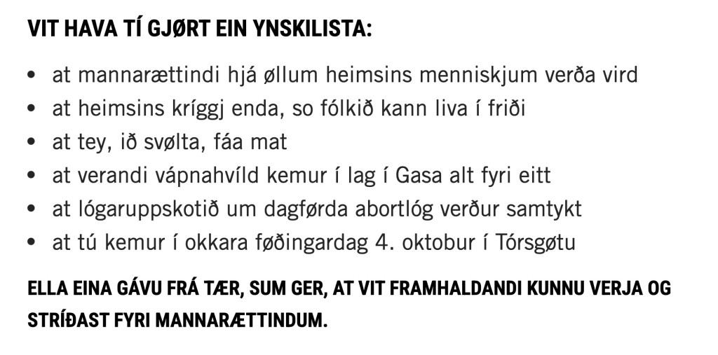 Í sambandi við føðingardagin hava tey eisini ein ynskilista, sum sæst niðan fyri.
