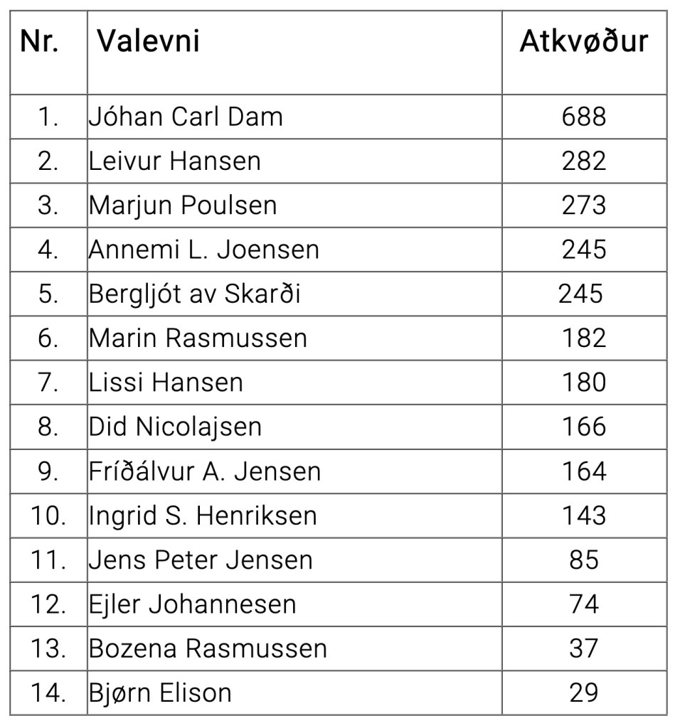 Úrslitið merkir, at Jóhan Carl Dam, Leivur Hansen, Marjun Poulsen, Annemi L. Joensen og Bergljót av Skarði eru vald í nevndina. Hinvegin eru Marin Rasmussen, Lissi Hansen og Did Nicolajsen vald sum varalimir.