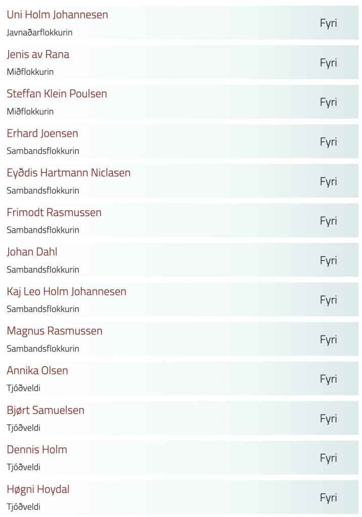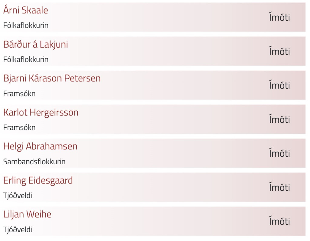 Tey vóru Erling Eidesgaard, Magnus Rasmussen, Árni Skaale, Frimodt Rasmussen, Liljan Weihe og Johan Dahl. Men tað uppskotið fekk bara 10 atkvøður fyri, tí afturat teimum vóru tað Jørgen Niclasen og hini fýra úr Sambandsflokkinum, sum atkvøddu fyri tí, og øll hini atkvøddu ímóti - so tað fall so ruddiliga.