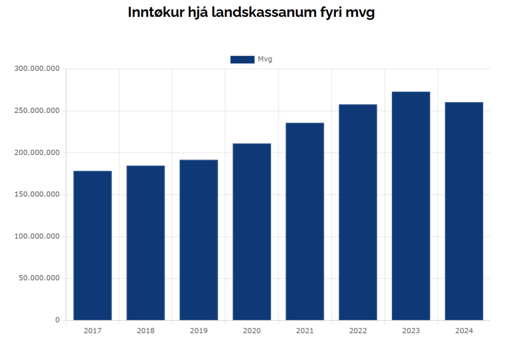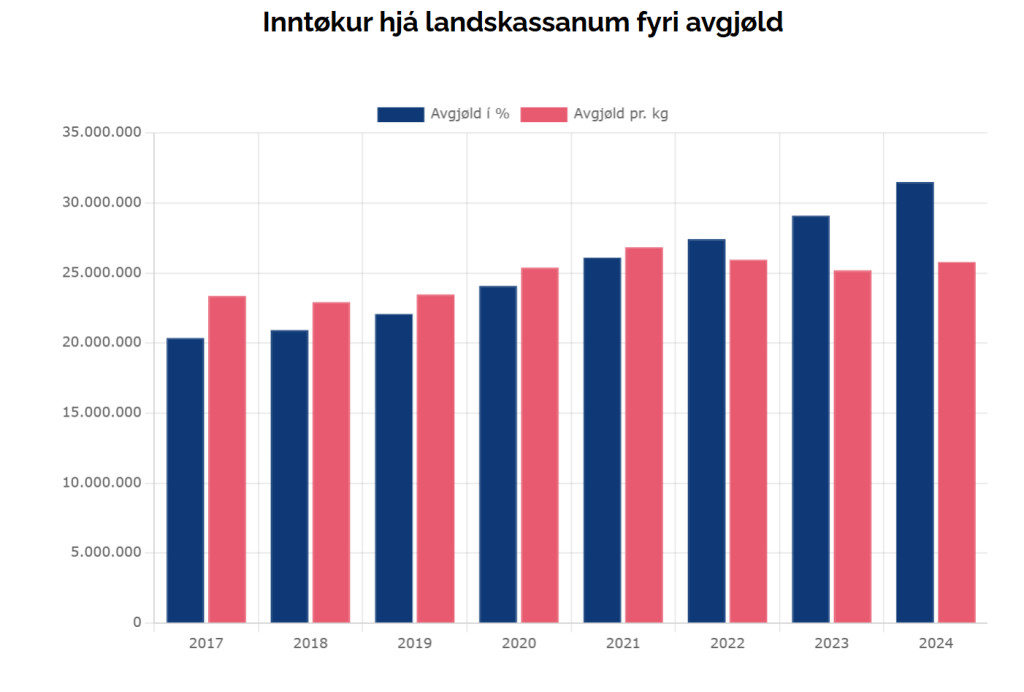 Handilsvinnufelagið, sum er vinnugreinafelag í Vinnuhúsinum, hevur tí umvegis innlitsumbøn savnað tøl frá TAKS, sum vísa, hvussu stórar inntøkur landskassin hevur fingið frá mvg, tolli og avgjøldum á matvørum í tíðarskeiðnum 2017–2024.
