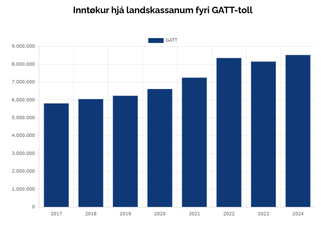 Í 2017–2024 hevur landskassin fingið 57 mió. kr. í GATT-tolli á matvørum. Stabbamyndin niðan fyri vísur inntøkurnar fyri hvørt ár.