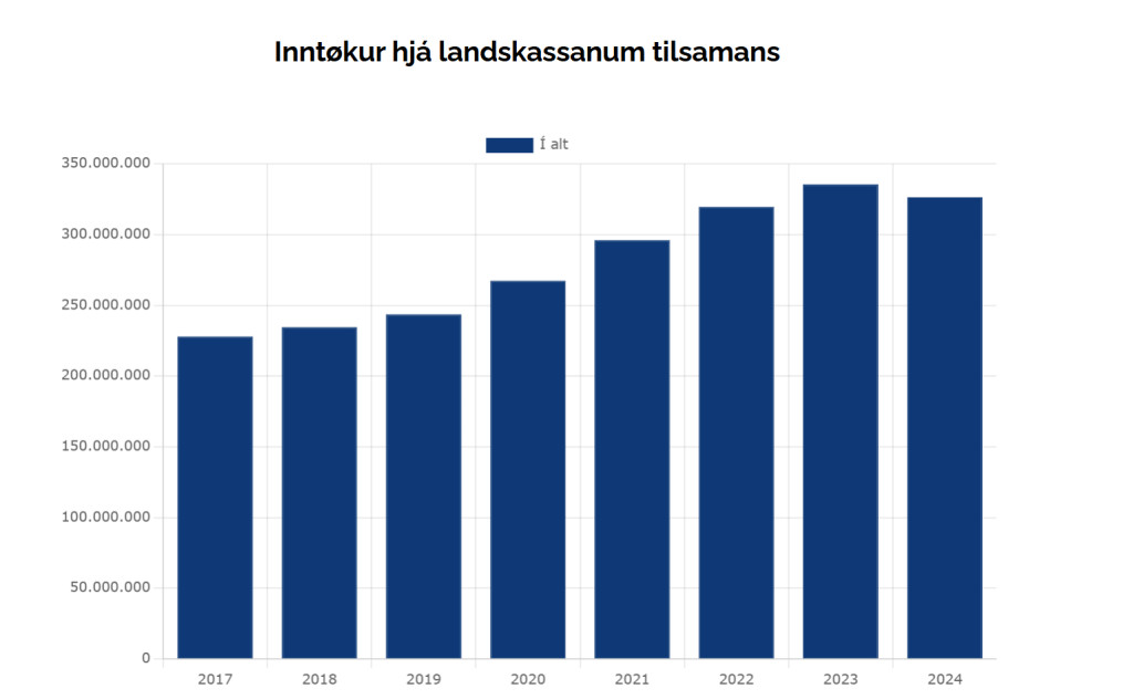 Bara í 2024 vóru inntøkurnar umleið 325 mió. kr. í mun til 230 mió. kr. í 2017. Hetta er ein vøkstur upp á slakar 100 mió. kr. upp á átta ár. Stabbamyndin niðan fyri vísur inntøkurnar til samans fyri hvørt ár.