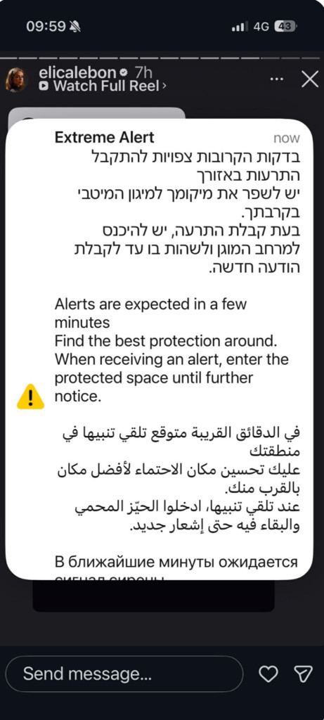 Áminning um, at Iran er við at loysa eina rakett, og tað tekur 10 min. til Bjørtfríð og familjan skullu vera í bumbuskýli.