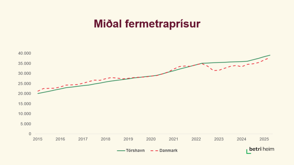 Fyrra hálvár í ár kostaði ein íbúðarfermetur í Tórshavn 39.100 krónur. Tað er 9% meira enn í fjør, tá fermetraprísurin var 36.000 krónur.