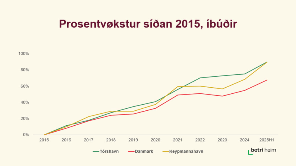 Til samanberingar eru sethúsaprísirnir í Tórshavn øktir við 110% síðan 2015, meðan sethúsaprísirnir í Keypmannahavn og Danmark eru øktir við ávikavist 91% og 47%.