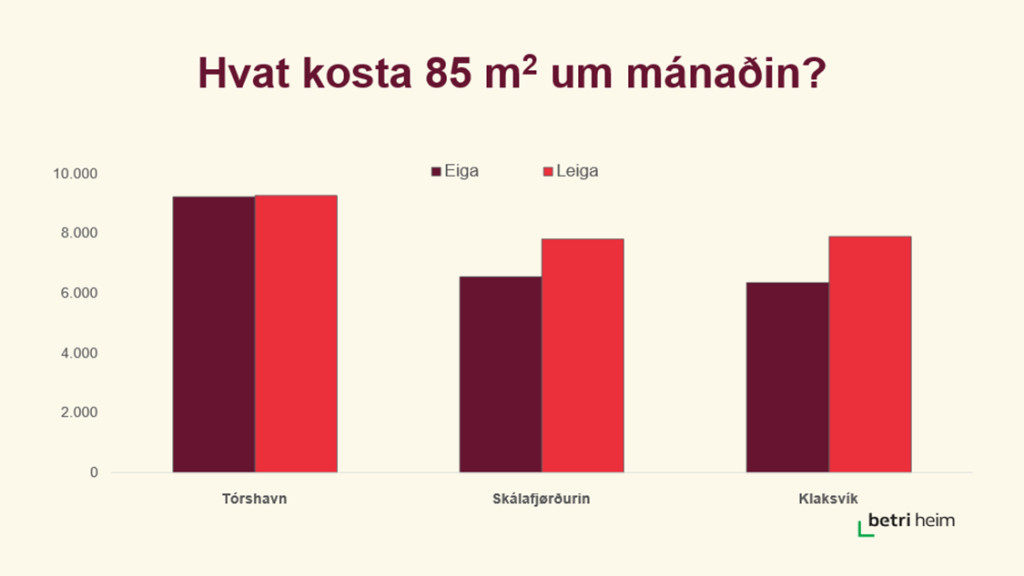 Keypir tú eina íbúð á 85 fermetrar, svara mánaðarligu útreiðslurnar til 9.200 krónur í Tórshavn, 6.500 krónur á Skálafjørðinum og 6.400 krónur í Klaksvík. Útreiðslurnar fevna um rentur (frádrigið rentustuðul), eigarafelag, trygging og viðlíkahald, men ikki niðurgjald av láninum.