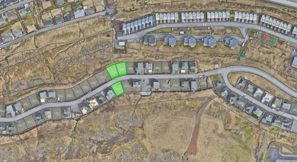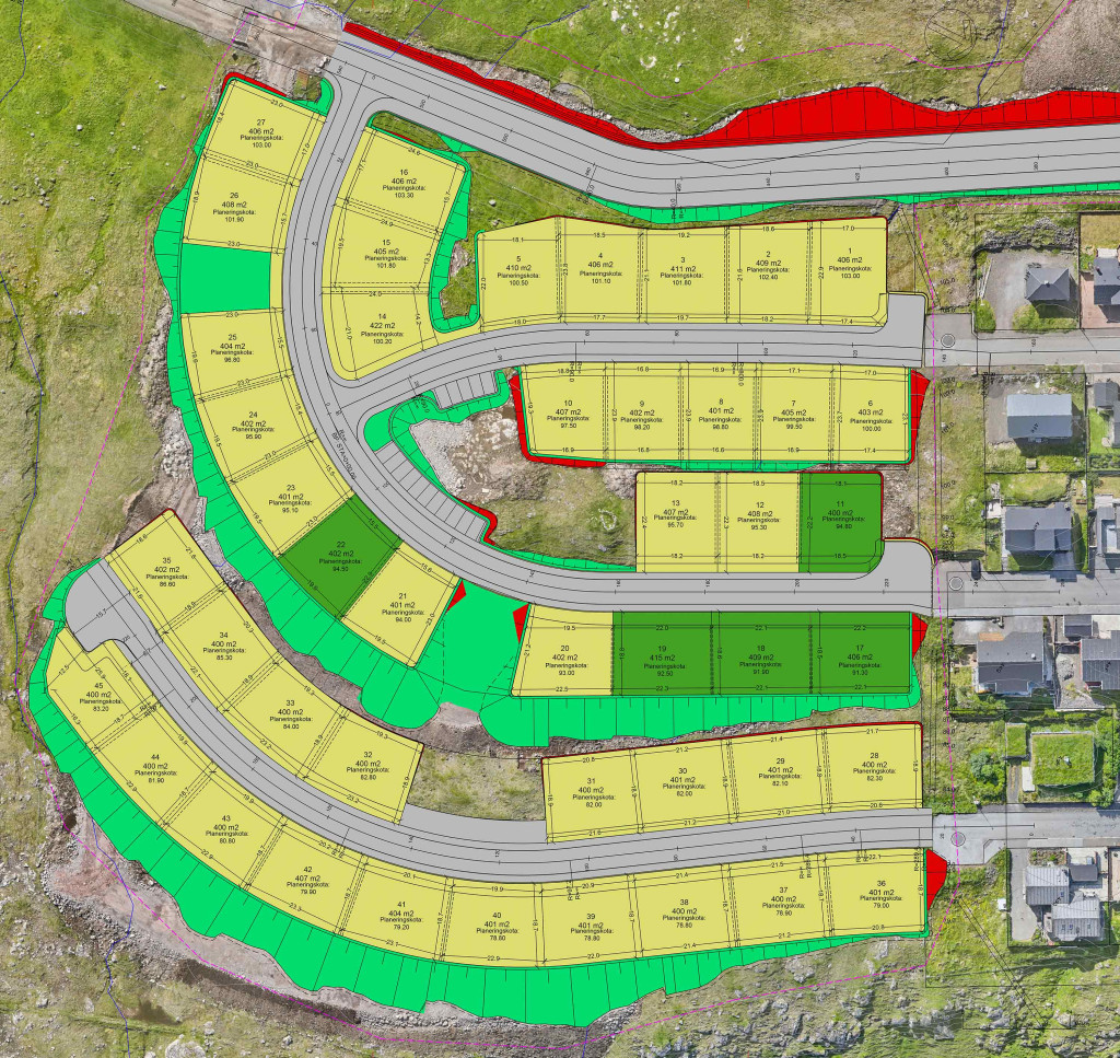Fimm grundstykki í nýggju útstykkingini á Argjahamri, ið er í gerð í løtuni.