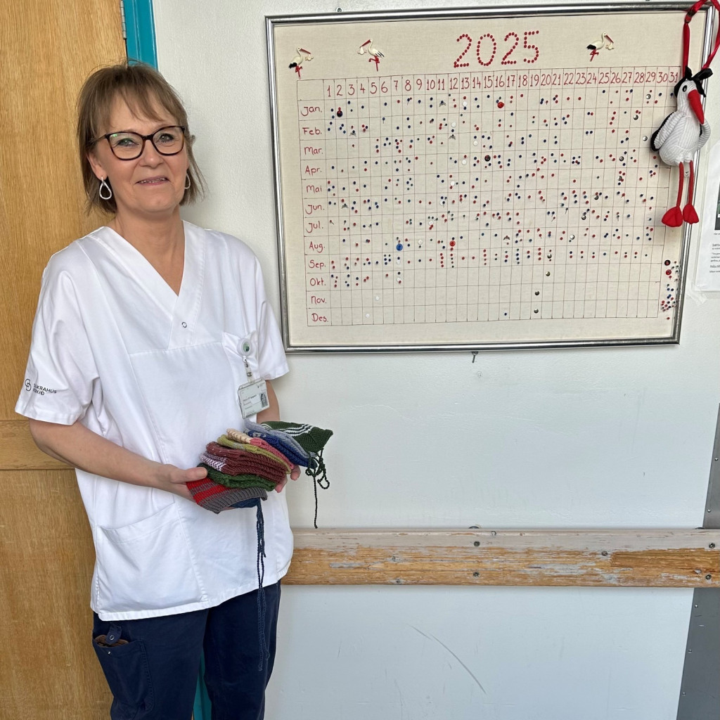 Við sínum tokka til at binda er Marjun Ellingsgaard ein tann fyrsta at bjóða nýføðingum vælkomnum inn í heimin. Tí Marjun hevur síðan marsmánað í ár bundið ikki færri enn 105 húgvur og trý klædnasett til nýføðingar á føðideildini, sum bæði børn og foreldur fáa gleði av.