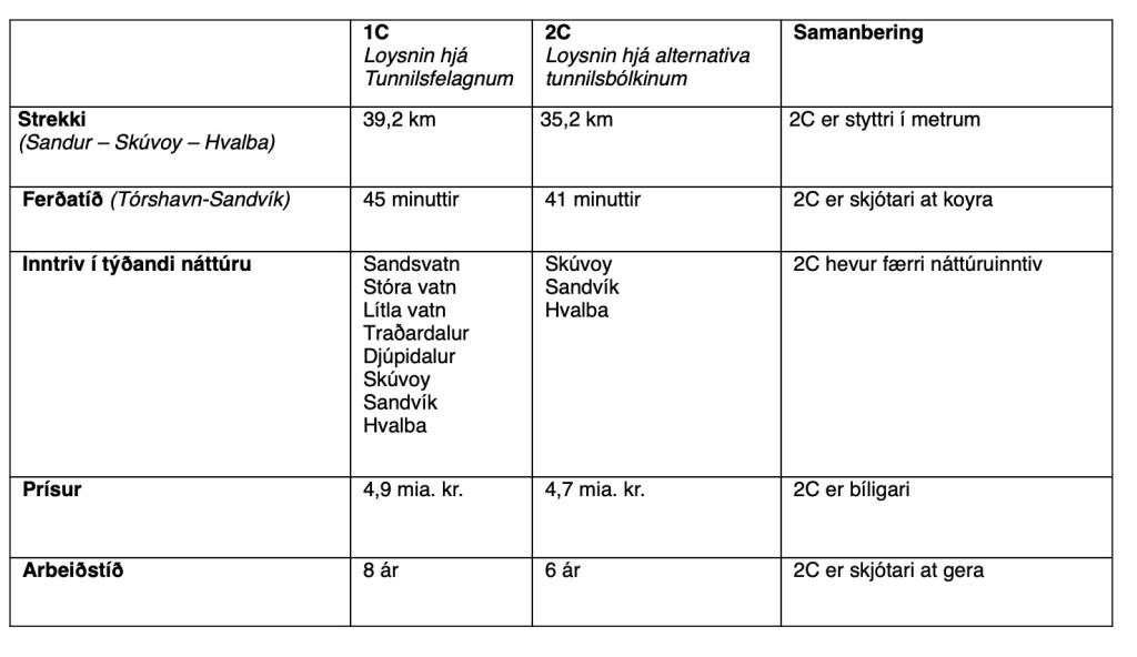Ein samanbering millum loysnina hjá Tunnilsfelagnum (1C eystan fyri Sandsvatn) og alternativa linjuføringin (2C vestan fyri Sandsvatn) vísir, at alternativa loysnin er styttri, skjótari at koyra, skjótari at gera og bíligari. Ferðatíðin millum Tórshavn og Sandvík verður 41 minuttir við 2C, í mun til 45 minuttir við 1C. Samstundis er arbeiðstíðin mett til 6 ár fyri 2C, í mun til 8 ár fyri 1C, og kostnaðurin er ávikavist 4,7 og 4,9 mia. krónur.