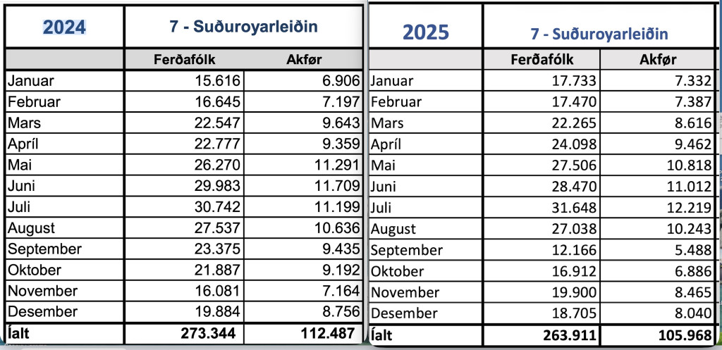 Tað vil siga, at ferðafólkatalið var 9.433 ferðafólk færri í fjør enn í 2024 og talið á bilum var 6.519 bilar færri.