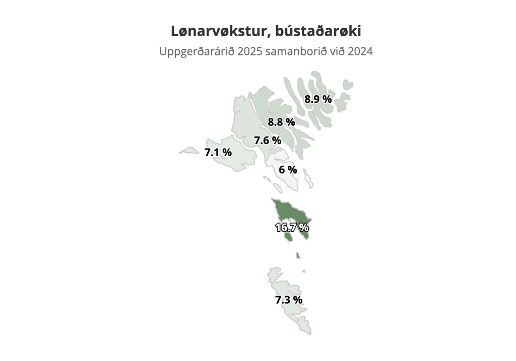 Uppgerðin hjá Hagstovuni vísir, at nógv tann størsti vøksturin var í Sandoynni, tí har vóru lønarútgjaldingarnar heili 16,7 prosent hægri í fjør enn tær vóru í 2024. Tilsamans vórðu 283,5 milliónir útgoldnar í lønum í Sandoynni í fjør og tað eru yvir 40 milliónir meiri enn í 2024.
