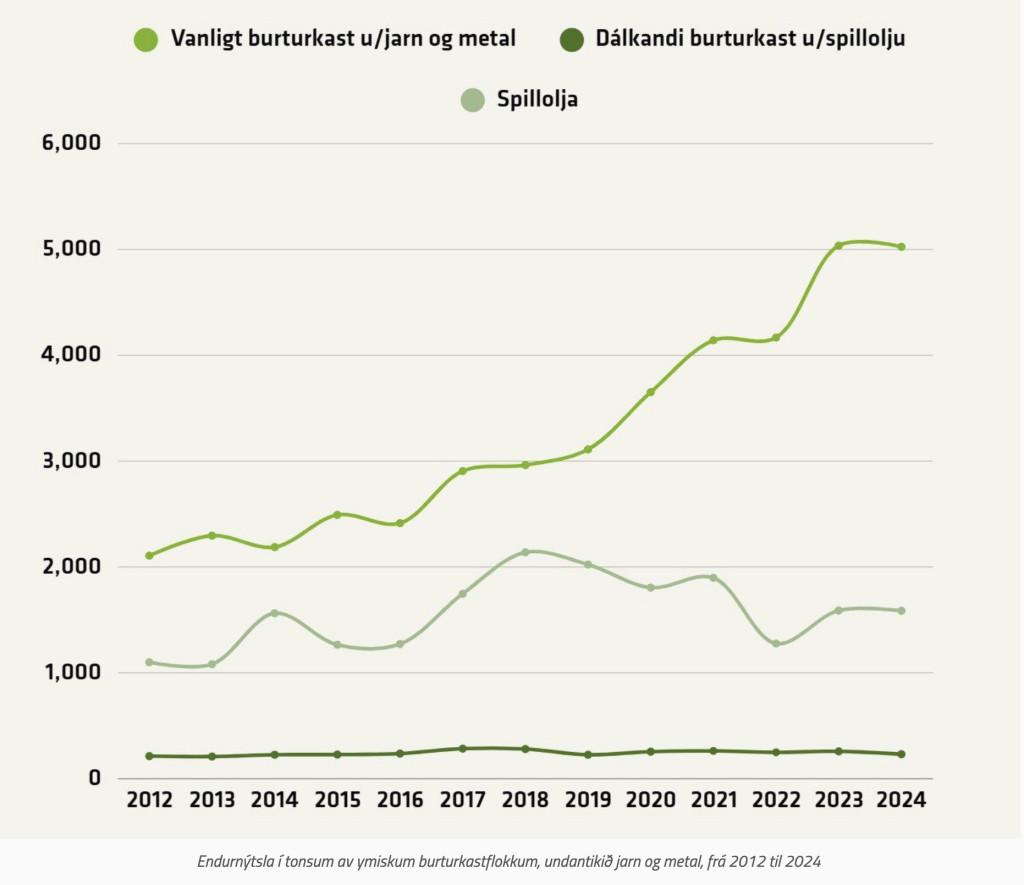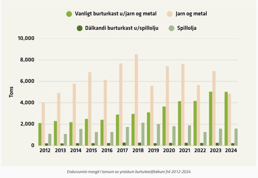 Verður jarn og metal verður tikið burturúr, sæst at nøgdin av vanligum burturkasti, sum fer til endurvinningar, er støðugt veksandi frá 3.650 tonsum í 2020 til góð 5.000 tons í 2024.