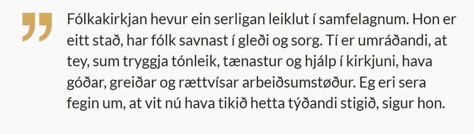 Uttanríkis- og mentamálaráðið hevur sett eina nýggja kunngerð í gildi, sum fyri fyrstu ferð ásetur greiðar karmar fyri samsýning, løn og eftirløn til kirkjutænarar og hjálparfólk í fólkakirkjuni. Hetta verður gjørt eftir áheitan frá Fólkakirkjuni.