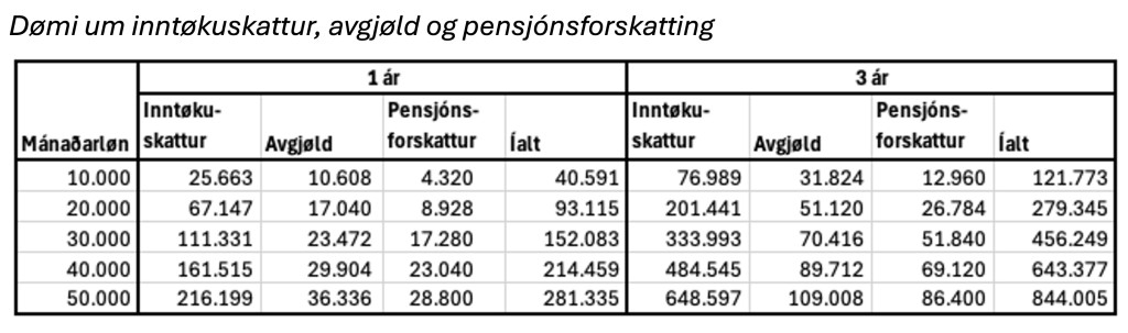 Talvan vísir, hvat løntakarar við ymiskari mánaðarløn rinda í inntøkuskatti, avgjøldum og pensjónsforskatti árliga og íalt í 3 ár.