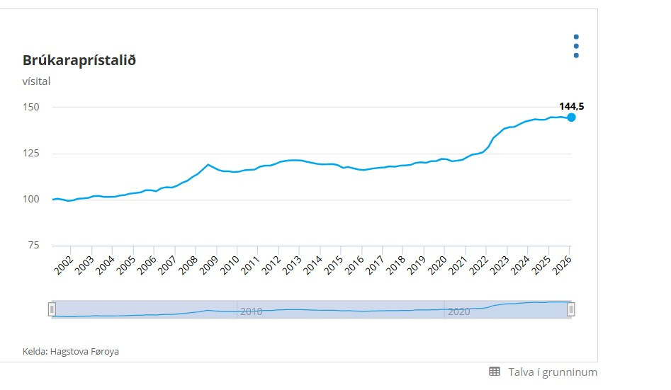 Prístalið lækkaði 0,2 prosent frá februar 2025 til februar 2026. Hóast prísvøksturin er minkaður seinasta árið, kann tað kennast øðrvísi fyri húsarhaldini, tí prísirnir eru hækkaðir 20 prosent seinastu fimm árini.