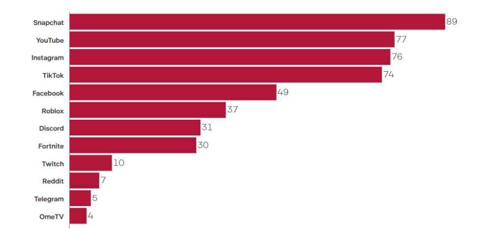 Niðanfyri eru teir sosialu miðlarnir, sum – sambært frágreiðing frá Miðlaráðnum fyri børn og ung – fylla mest í gerandisdegnum hjá donskum børnum og ungum millum 13 og 17 ár: