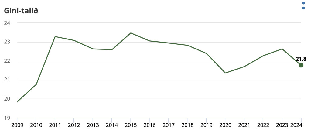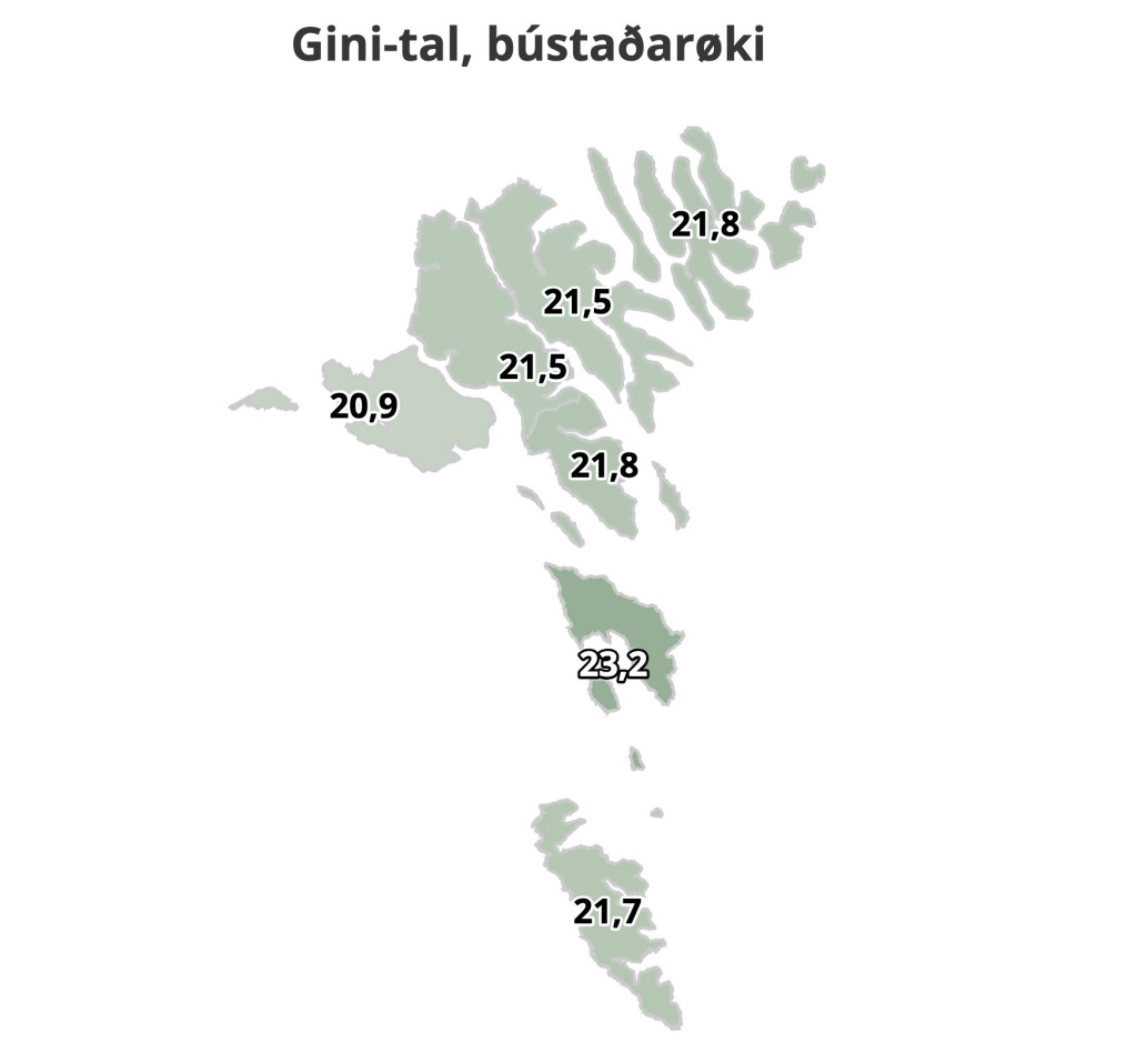 Í 2023 var gini-talið 22,6, men í 2024 lækkaði tað niður í 21,8. Tað er fýra ár síðani, at gini-talið kvinkar niðureftir, sigur Hagstovan.