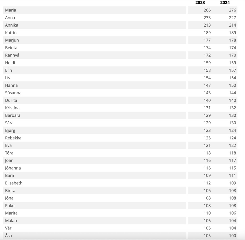 Á talvuni niðan fyri sæst, hvørji kvinnunøvn eru tey mest vanligu