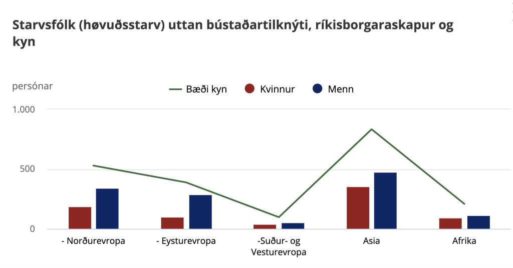 Myndin er heilt øðrvísi tá ið talan er um útlendsku arbeiðsmegina úr Eysturevropa, har talið á monnum er tríggjar ferðir hægri enn talið á kvinnum.