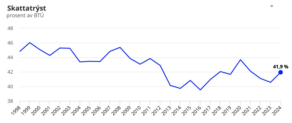 Skattatrýstið í Føroyum var 41,9 prosent í fjør. Tað er 1,3 prosent-stig størri enn í 2023.