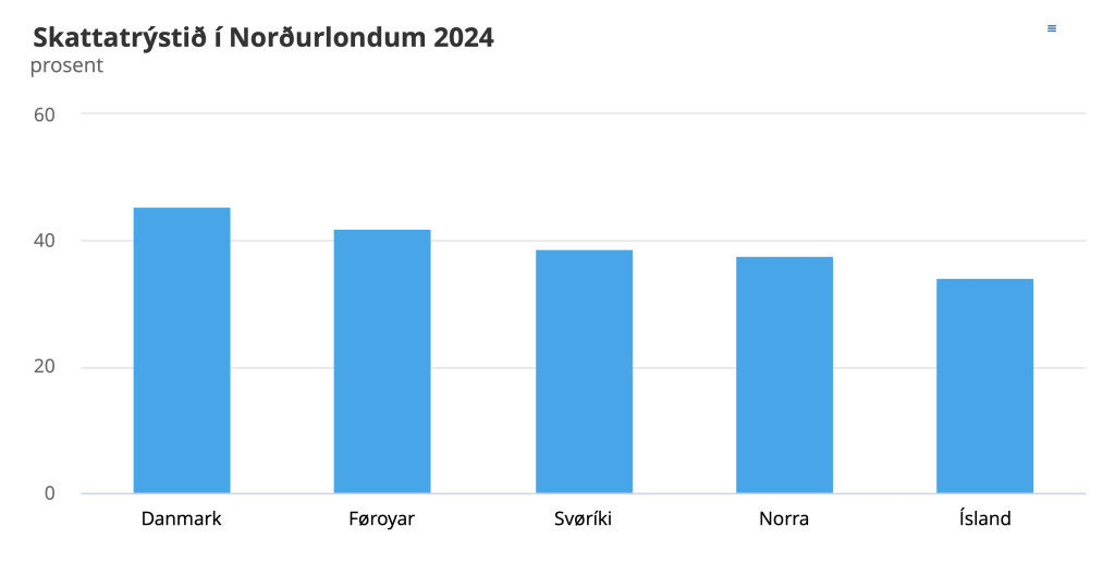 Í Danmark er skattatrýstið 45,4 prosent sum er 3,5 prosent-stig hægri enn í Føroyum. Men so eru heili 11,3 prosent-stig niður til Ísland, sum hevur lægsta skattatrýstið.