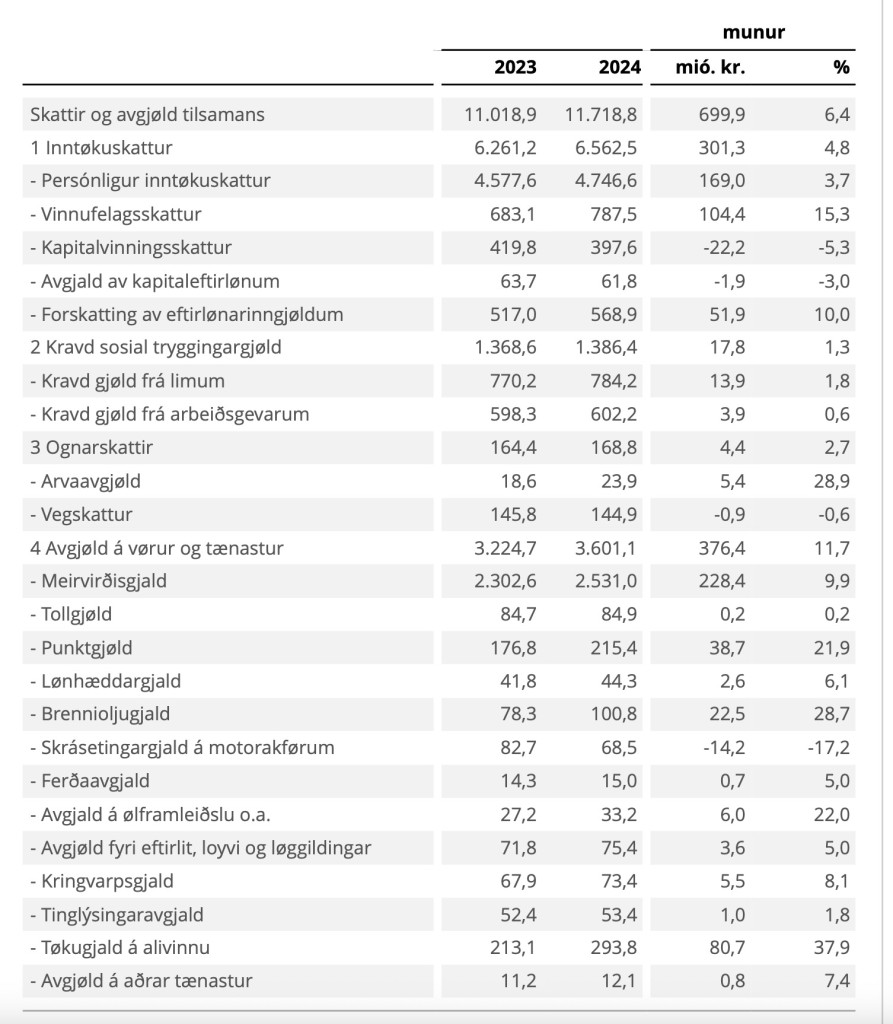 Tað eru slakar 700 milliónir krónur, ella 6,4 prosent meiri enn í 2023. Skattatrýstið er skattir og avgjøld í prosent av bruttotjóðarúrtøkuni.