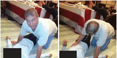 Myndir frá amerikanska rættarmálaráðnum vísa Andrew Mountbatten-Windsor, tá prinsur, á gólvinum saman við einum ókendari kvinnu ella gentu.
