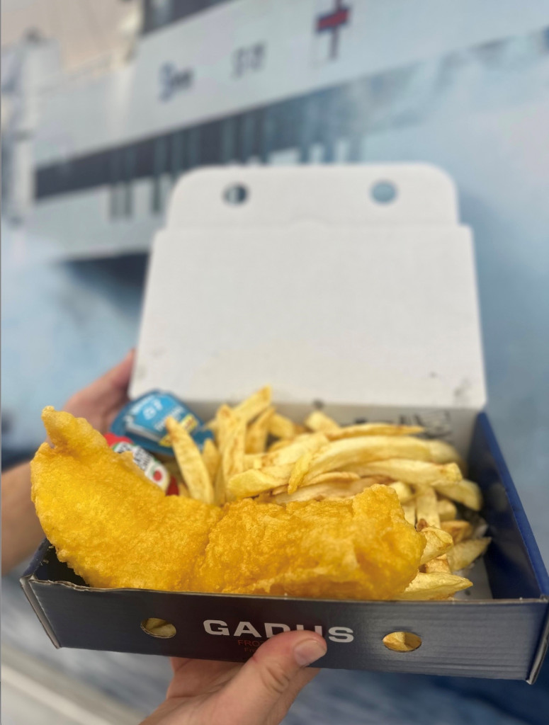Fiskurin er fyrstafloks toskur frá nýggja Gadus, meðan chipsini verða framleidd úr nýggjum eplum úr Onglandi, sum eru serliga væl egnað til endamálið.