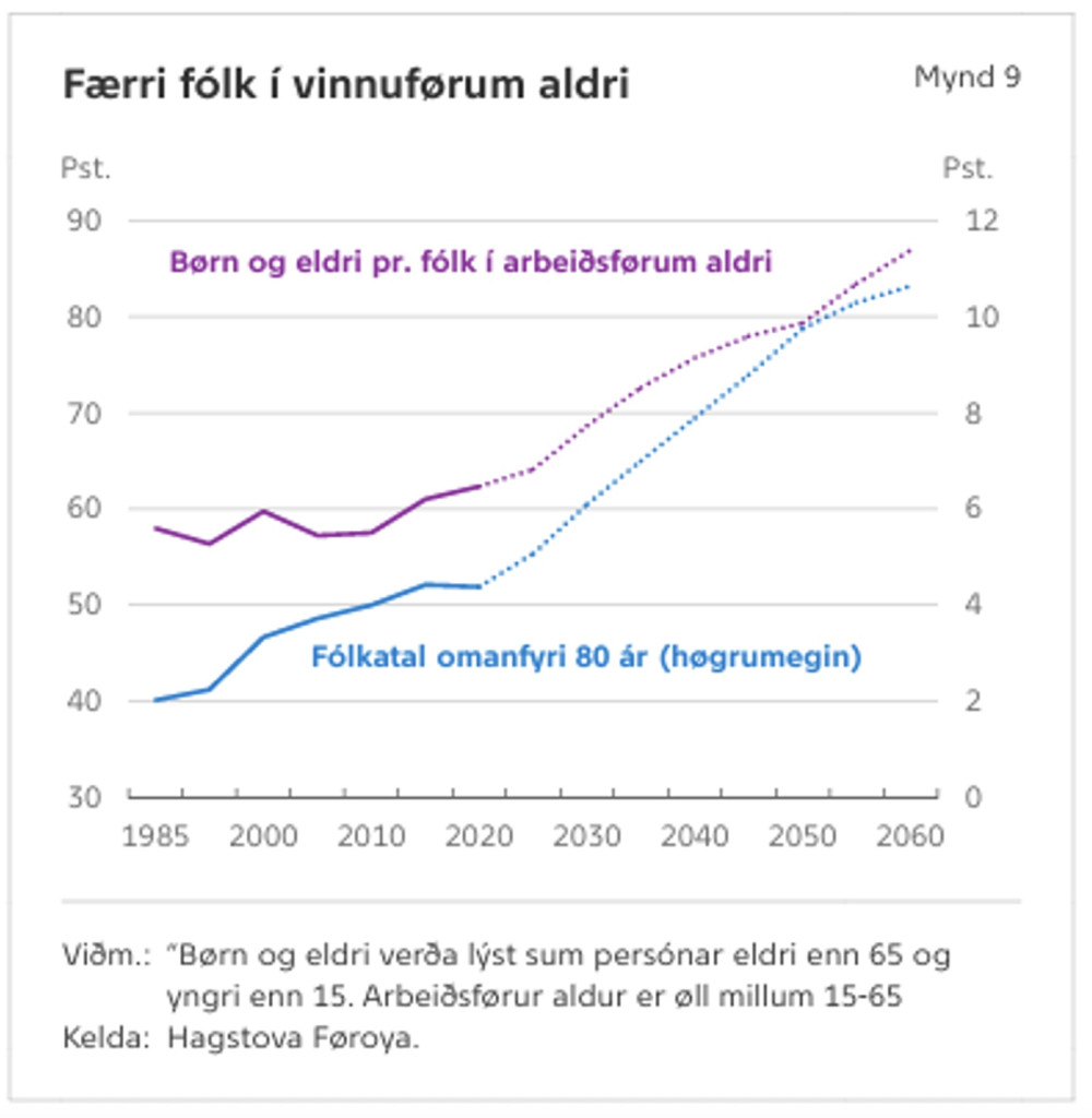 Í 2060 gerast vit nær um líka nógv fólk í arbeiðsførum aldri (15-65 ár) sum fólk í óarbeiðsførum aldri (yngri enn 15 ár/eldri enn 65 ár). Forsøgnin greiðir okkum frá, at arbeiðsføri og óarbeiðsføri í Føroyum fer at javnviga í 2060-unum (0,9 óarbeiðsført fólk fyri 1,0 arbeiðsført fólk).