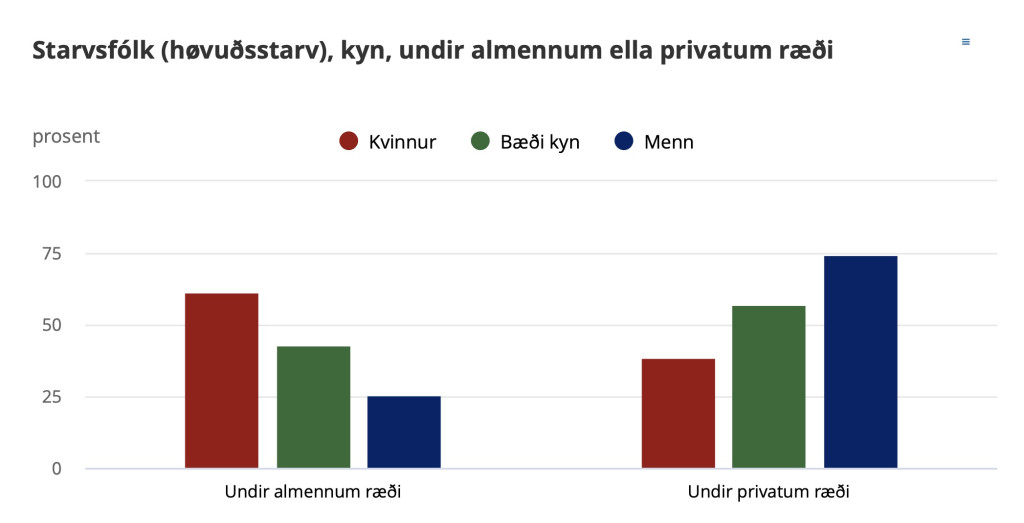Men verður hugt at kynsbýti, er søgan ein onnur. Støðan er nevniliga tann, at 75 prosent av monnum arbeiða hjá privatum arbeiðsgevarum; og 25 prosent hjá tí almenna.
