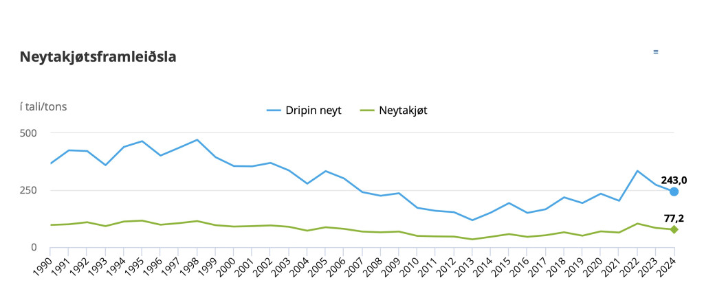 Eftir tað var ein ávís uppgongd og í 2022 framleiddu vit 103 tons á føroyskum neytakjøti. Men síðani er tað minkað aftur til tað er komið niður á 77,2 tons í fjør.