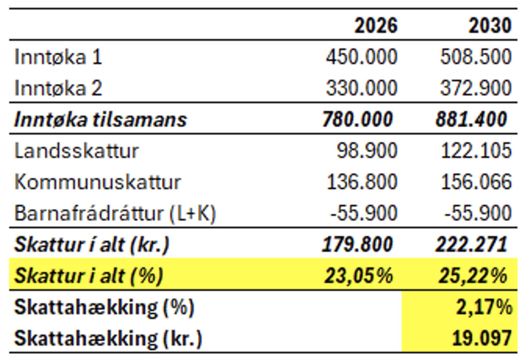 Also: um hækkingin í inntøkuni verður óbroytt, og skattasatsir ikki verða hækkaðir samsvarandi, so fer skattatrýstið hjá hesari familjuni at hækka 2,17 %-stig svarandi til 19.097 kr. í 2030.