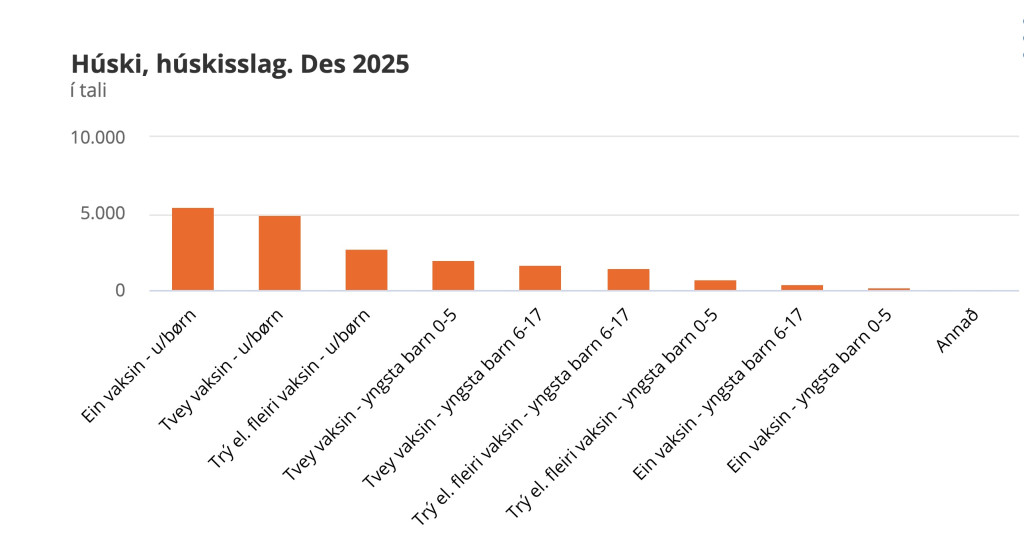 Næststørsti bólkurin eru húski, har tað búgva tvey vaksin fólk við ongum børnum, tí tey eru akkurát 5.000 í tali. Og triðstørti bólkurin eru húski, har tað búgva trý vaksin, ella fleiri vaksin, við ongum børnum, tí tey eru 2.745 í tali.