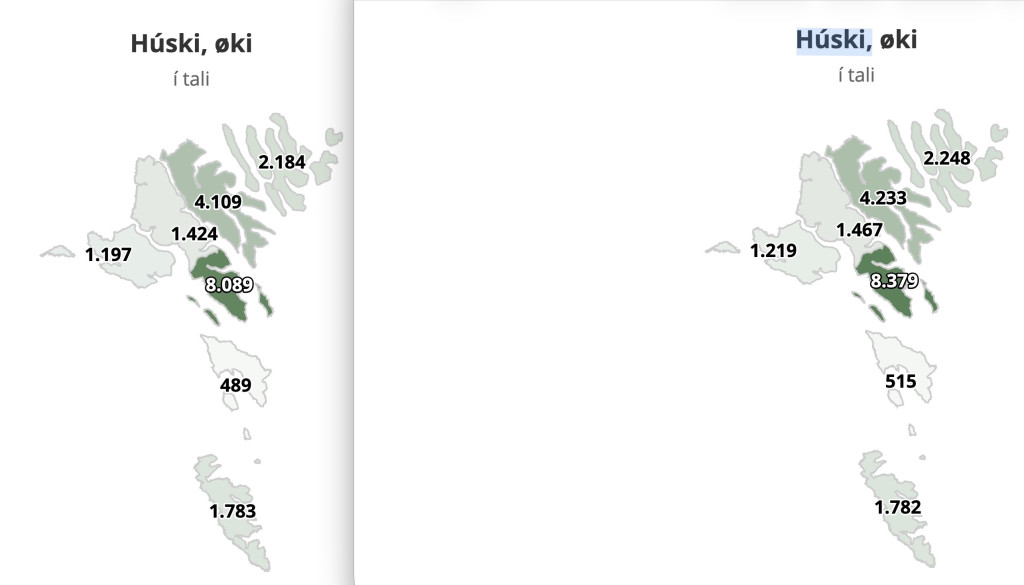 Sum tað sæst á talvuni niðan fyri, er talið á h´skjum vaksið eitt sindur allastaðni, uttan í Suðuroy, har tað er minkað eitt húski. Vinstruvegin er talið á húskjum 1. desembur í 2024 og høgrumegin er talið á húkjum 1. desembur í fjør.