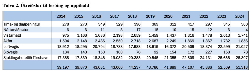 Talvan niðan fyri vísir býtið ímillum ferðing og gisting eins og hvat útreiðslurnar til sjúklingahotellið Tórshavn hava verið um árið. Tøl eru bara til taks hesi seinastu 10 árini.