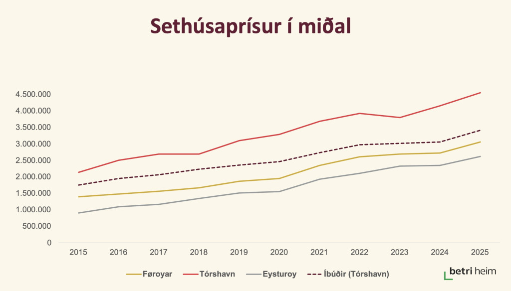 Í Eysturoynni kostaðu húsini 2,6 milliónir krónur í miðal í fjør. Tað eru 12 prosent meira enn í 2024, tá miðalprísurin var 2,3 milliónir krónur.